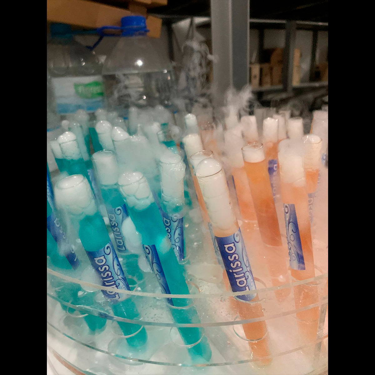 São servidos durante a festa contendo drink mais o efeito do gelo seco.
